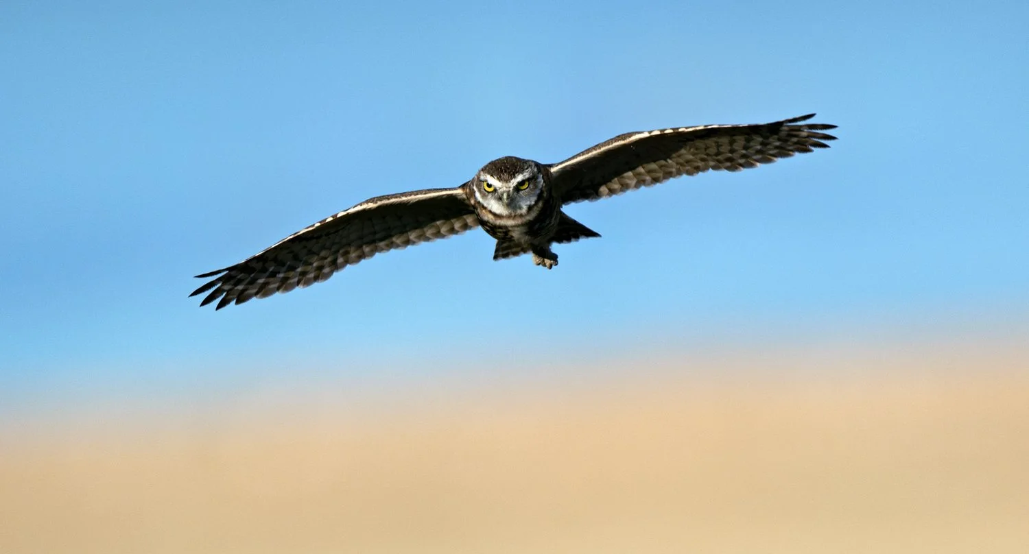 Mel and I are at the Salt Creek Marsh on a day in June. Above us, a raft of pelicans dance in the sky, their white feathers made gold in the afternoon light. We are here to check on the burrowing owl babies, fluff balls of feathers that shine in the sun. While Mel often remains in the car on these trips, she is the first to spot every single bird that comes to the marsh, often without binoculars. Even against the sun, she can name birds based on how they lift or land or hold their heads. She knows them from the inside. Not unlike the flammys who look for abandoned flicker cavities, burrowing owls prefer holes made by marmots. One of the few owls considered diurnal, they spend their days near their burrows eating grasshoppers and watching out for harriers.